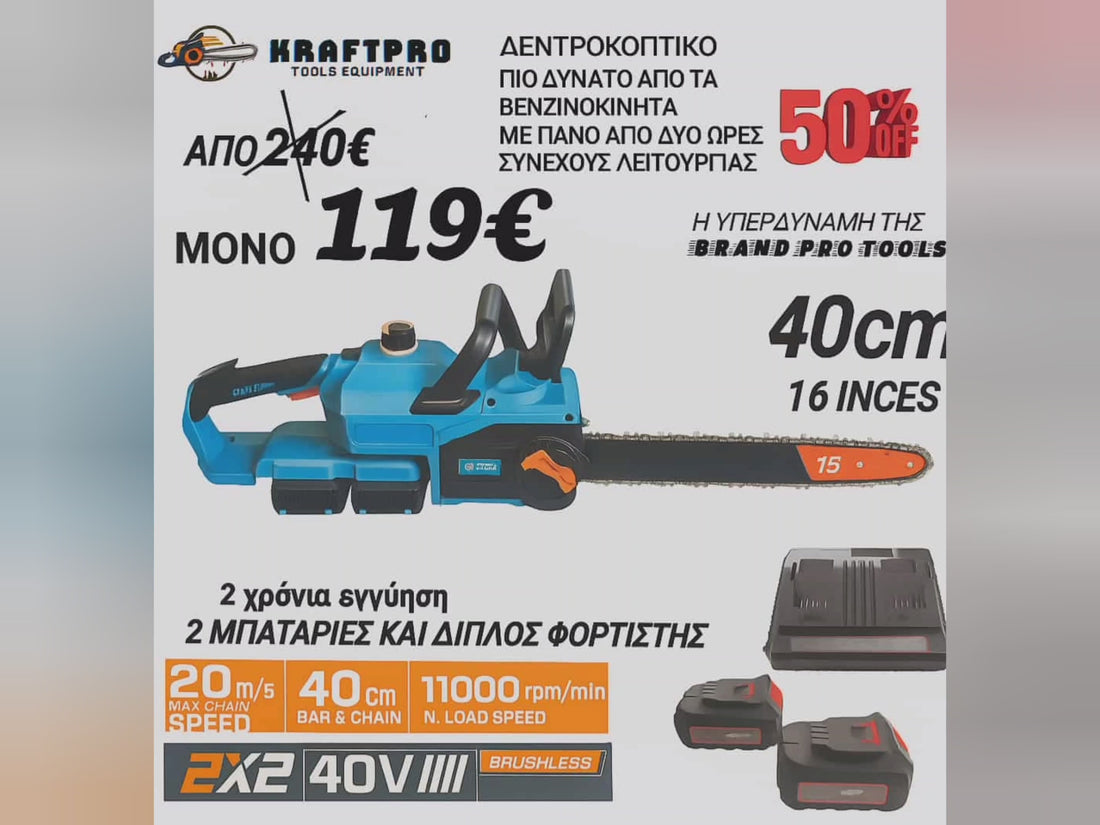 KRAFTPRO ΑΛΥΣΟΠΡΙΟΝΟ ΜΕ 2 ΜΠΑΤΑΡΙΕΣ ΜΕ ΛΑΜΑ 16" ΙΝΤΖΩΝ 40cm ΚΑΙ ΔΙΠΛΟΣ ΦΟΡΤΙΣΤΗΣ ΑΥΤΟΜΑΤΗ ΛΙΠΑΝΣΗ