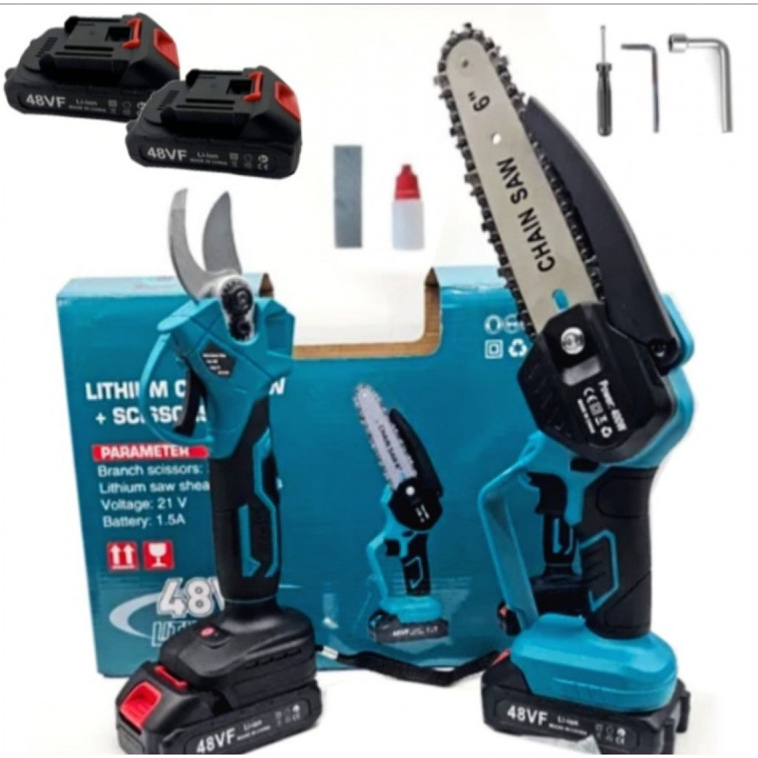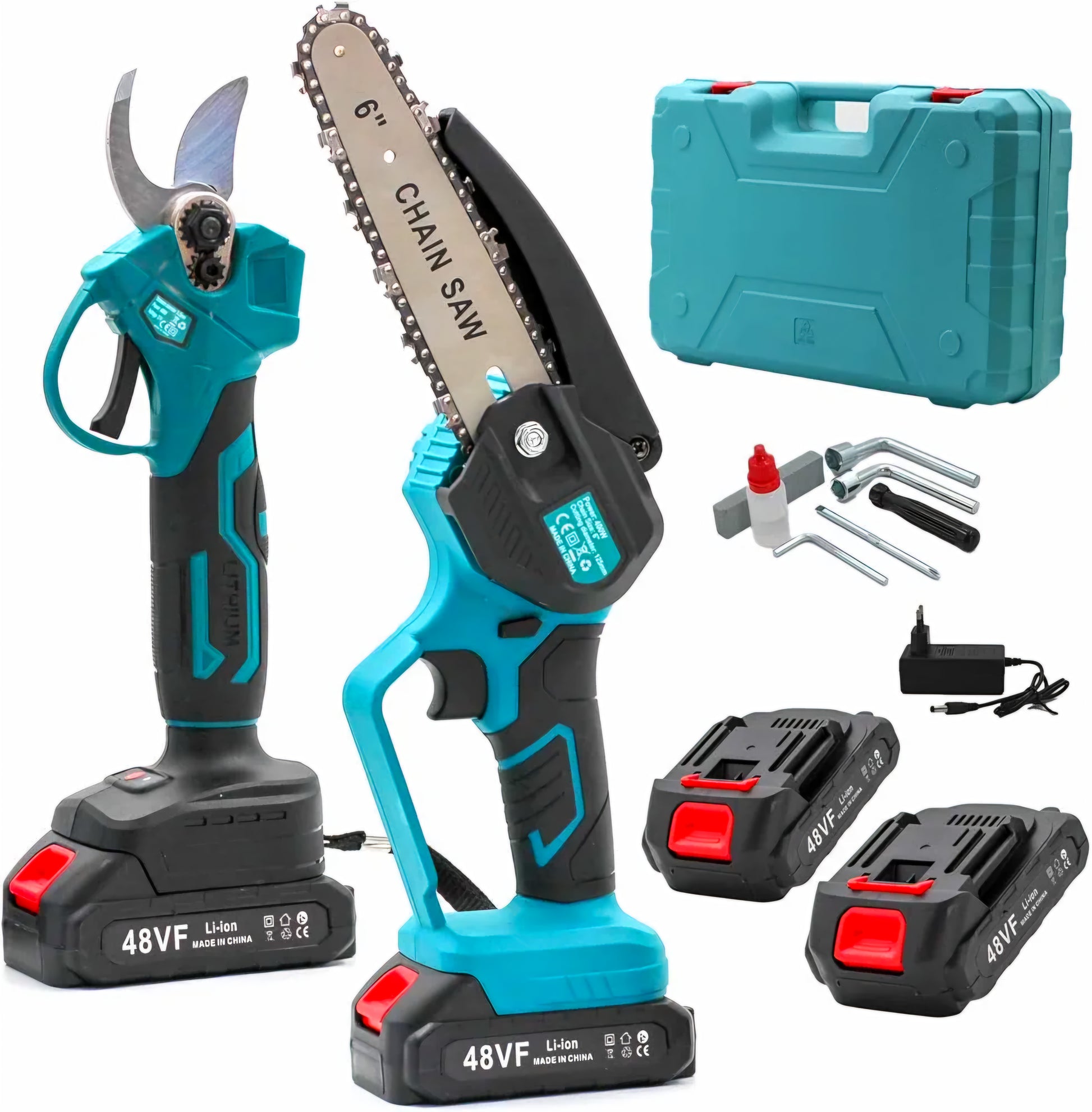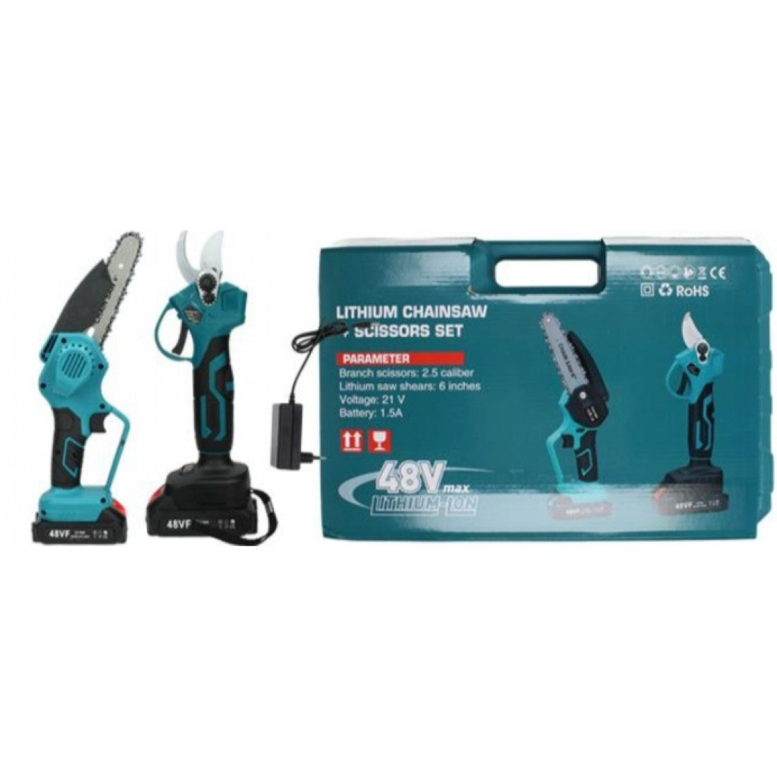Το σετ περιλαμβάνει ένα mini αλυσοπρίονο και ένα ψαλίδι κλαδέματος, ιδανικά για κλάδεμα δέντρων, θάμνων και άλλων εργασιών κοπής. Το αλυσοπρίονο διαθέτει λάμα 6" και ταχύτητα αλυσίδας 5m/s, εξασφαλίζοντας αποτελεσματική κοπή. Το ψαλίδι κλαδέματος λειτουργεί με δύο ρυθμίσεις ανοίγματος για κοπή κλαδιών διαφορετικού πάχους. Και τα δύο εργαλεία λειτουργούν με επαναφορτιζόμενες μπαταρίες 48V, προσφέροντας αυτονομία και άνεση στη χρήση χωρίς καλώδια. Το σετ περιλαμβάνει όλα τα απαραίτητα αξεσουάρ για συντήρηση και εύκολη μεταφορά.